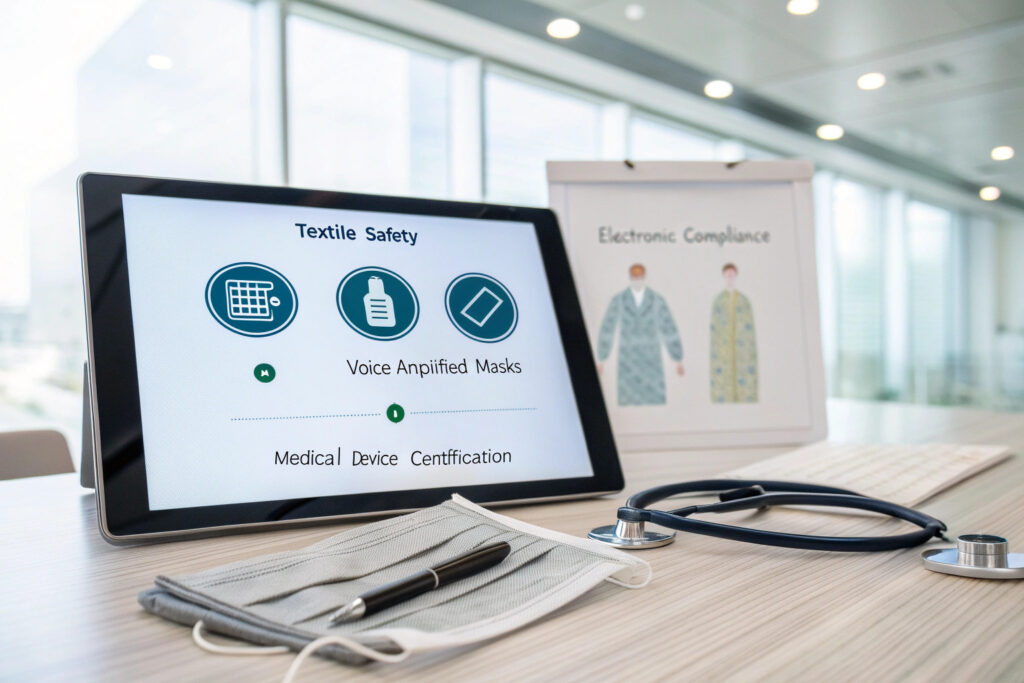 Voice-amplified masks must meet both textile/product safety standards and electronic device regulations.
