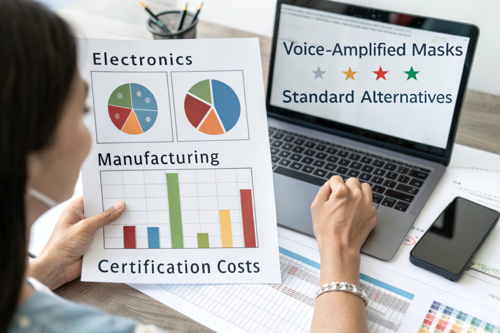 Electronic components and integration labor typically increase mask costs by 300-600% compared to standard fabric masks. A basic voice-amplified mask might cost $18-35 compared to $3-8 for a standard equivalent. The cost structure includes electronics (40-50%), specialized manufacturing (25-35%), certification (10-15%), and battery/packaging (10-15%). Our value engineering has reduced costs by 35% through component consolidation and manufacturing optimization.